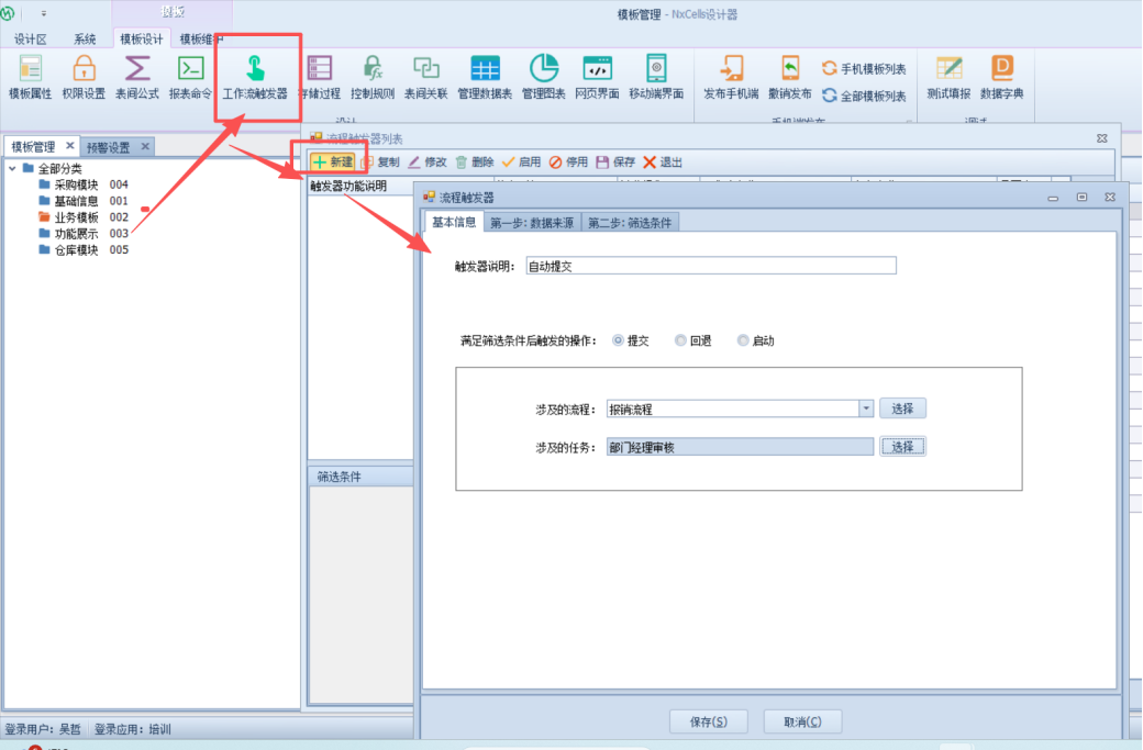 上一页 【设计器】-【模板设计】-【工作流触发器】-【新建】填写触发器说明;选择要触发的操作;选择涉及到流程以及具体任务;选择触发的工作流当中涉及到的模板填写筛选条件下一页作者:wang 创建时间:2021-11-05 09:27最后编辑:wuzhe 更新时间:2025-12-17 16:36