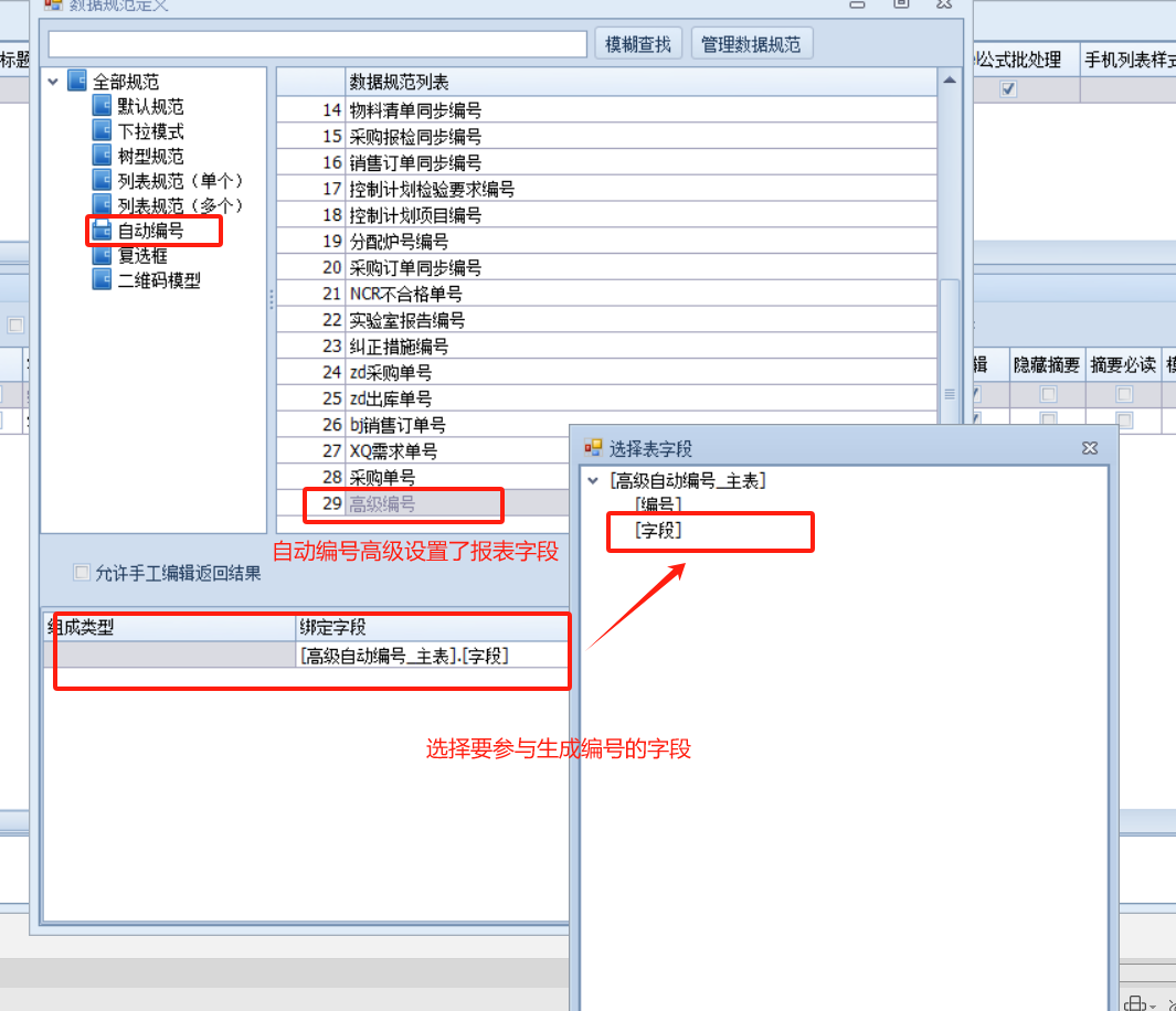 高级设置了自动编号选择了报表字段组成时,在管理数据表绑定其字段如下图: