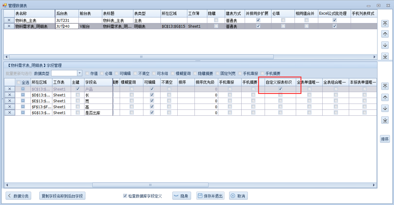 自定义报表标识勾选上,用于匹配,不然前台表不知道根据什么来进行补充,本文用于展示,勾选产品字段
