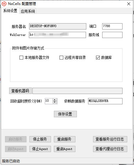 NxCells安装时,默认已经建立了一个应用,名为”默认应用系统。若想自己创建应用系统,则需要在”NxCells服务器配置”中进行配置。此主要是用于设置系统运行的全局信息。