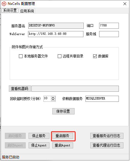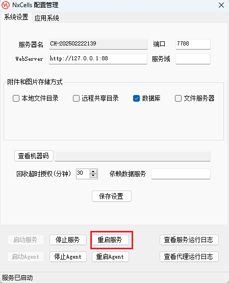 在服务端计算机的菜单【NxCells】-【NxCells服务器配置】界面,用【重启服务】来控制服务的启动和停止。如下图: