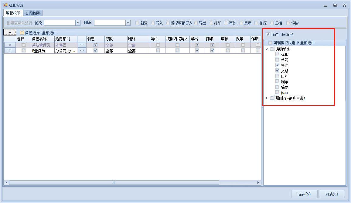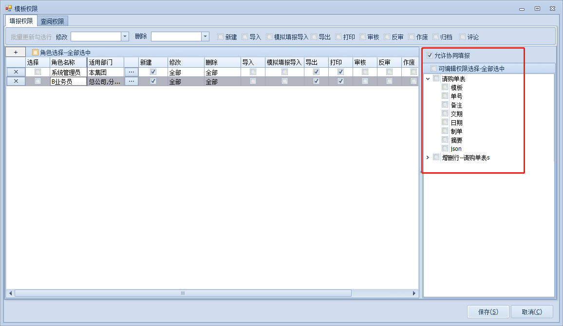 上一页 此功能主要是将权限明确到字段级,即可选的字段才有操作编辑的权限,未勾选的字段是没有操作编辑的权限的。多个用户角色协作完成单据输入 另外,最上方的允许协同填报如若勾选,那么必须所有的角色都要勾选。即右侧的权限勾选显示只是针对当前行选中的角色,其他的例如填报权限角色还未有授权字段权限,如下: 下一页作者:wang 创建时间:2021-11-04 10:36最后编辑:test 更新时间:2025-10-14 15:38