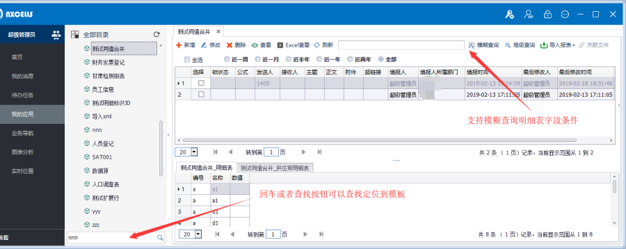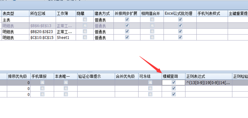 如果需要模糊查询明细表字段,需要在管理数据表字段勾选模糊选项(仅明细表字段需要勾选,主表字段默认匹配在工作台中显示的全部字段)