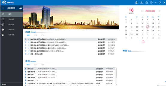 此栏目包括最近未阅消息、代办流程、个人日程、预警信息等。