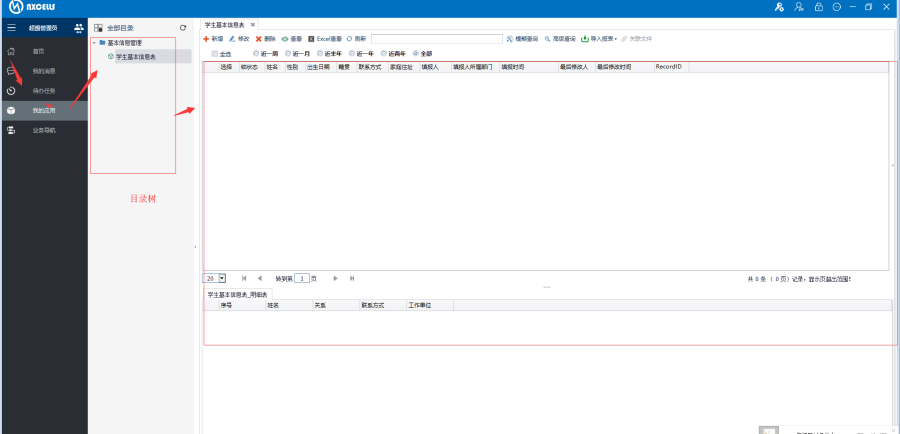 “我的应用”功能下分左右两部分,左侧是分类树,右侧是列表区(我们称作”总表”),也是表单的操作以及展示区域;