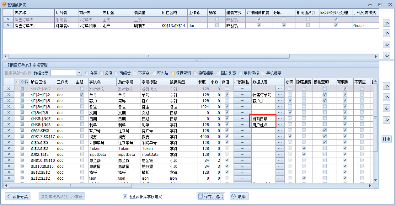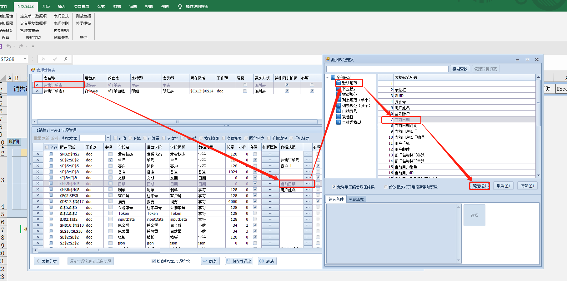 打开《销售订单》模板,选择菜单栏【管理数据表】—【销售订单表s】—选择字段【制单】—点击【数据规范】后的【…】,弹出窗口左侧选择【默认规范】,右侧数据规范列表选择【用户姓名】,点击确定。如下图: