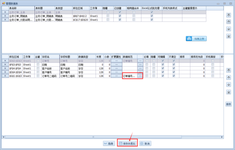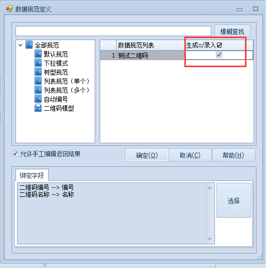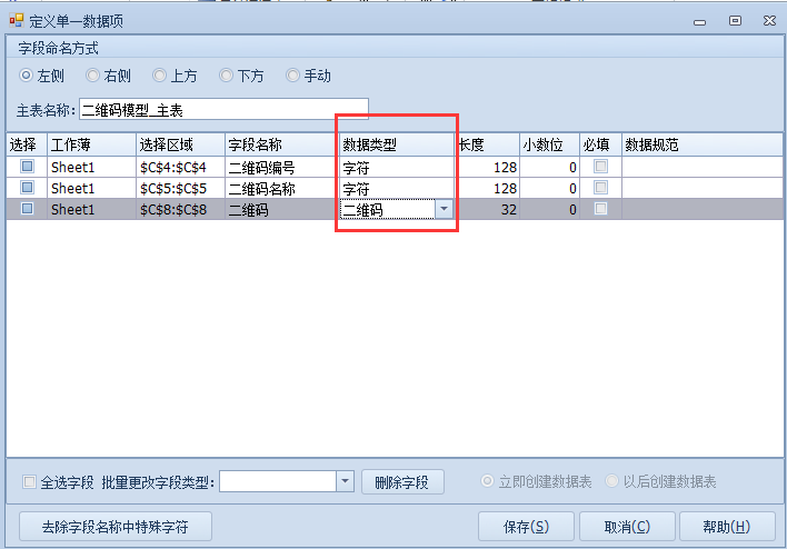 菜单栏【管理数据表】—>表【二维码模型_主表】—>字段【二维码】—点【数据规范】后面的【…】,如下图: