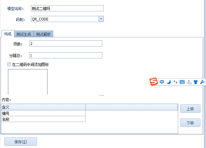 弹出的窗口里,输入【模型名称】,【码制】选择”QR_CODE”,构成里【项数】输入2(表示由两个字段组成),【分隔符】输入”|”,根据实际情况完成内容,点击【保存】按钮,如下图: