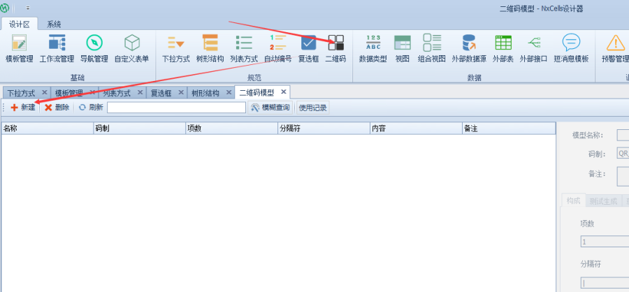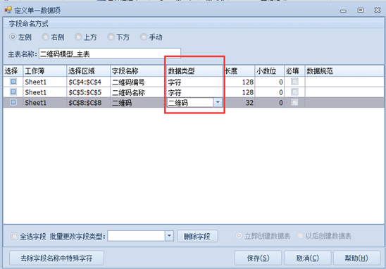 新建一个名称为《生成二维码》的模板,定义三个字段,分别为【二维码名称】,【二维码编号】,【二维码】,数据类型如下: