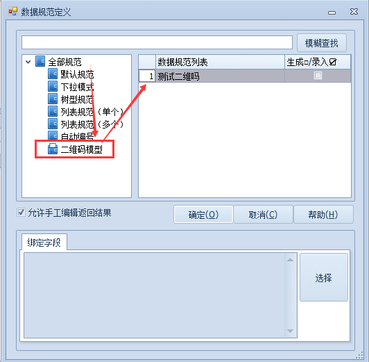 弹出窗口左侧选择”二维码模型”,选择”测试二维码”,点【选择】按钮,如下图: