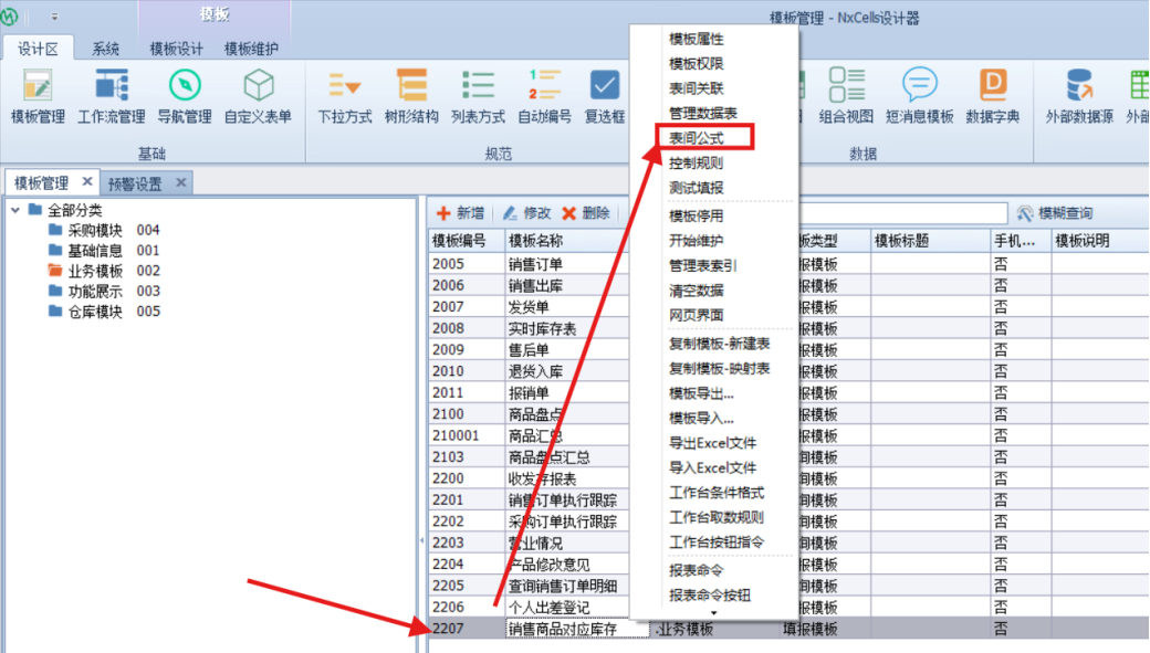 【设计区】—【模板管理】— 选择要设计的模板《提取公式》,点上方菜单栏或者右键快捷菜单里【表间公式】按钮。如下图: