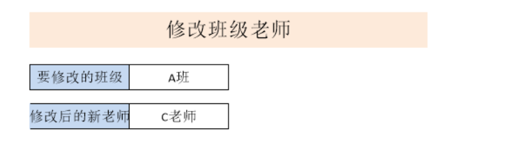 现A班级的班主任A老师由于个人原因去了其他学校,现在需要由C老师来负责A班级。两种方式实现,一种是直接打开《班级信息表》中的存储A班级的表单,直接修改;一种是通过做个修改单来回写修改。