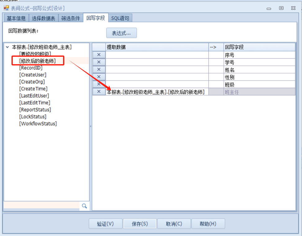 回写字段是把本报表里的字段填入到所选择的”数据表”对应的字段里去,如下图:
