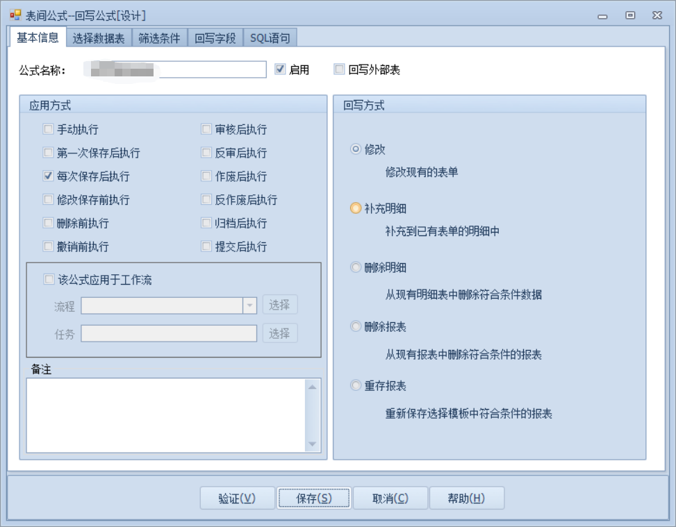 进入表间公式列表,选择【回写公式】,然后点【新建】按钮,进入了”回写公式”界面,如下图: