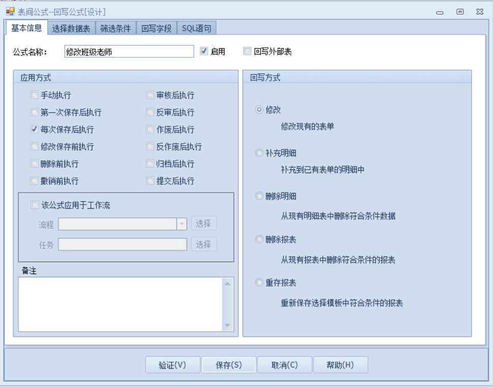 对于回写方式为”修改”的回写公式,一般是用来回写状态即字符类,不建议回写数值,数值的回写中,来回的保存删除可能会导致数值出错,比如通过一个表单修改了之后又删除了该表单,如果没有做其他操作的话会导致数据停留在回写后的数据而不是回写前的。