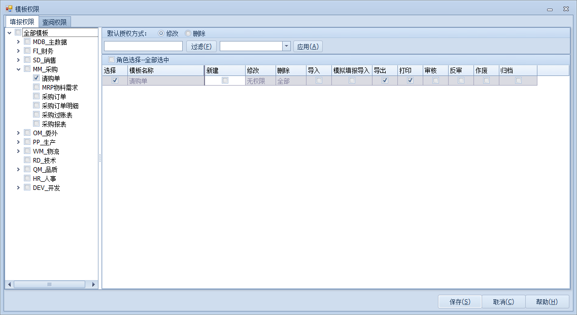 在弹出的窗口里,主要包含两部分,”填报权限”、查阅权限”,因为删除归类于填报权限,此处我们只展示填报权限,对查阅权限暂不说明。在”填报权限”找到需要绑定的《请购单》模板,勾选;勾选后在右侧根据实际需求进行勾选权限操作,此处只展示填报权限。