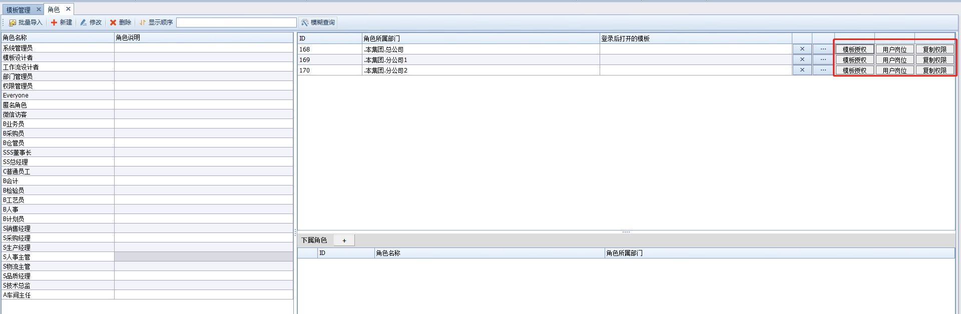 【系统】—【角色】—选择角色【删除权限】—【模板授权】,如下图: