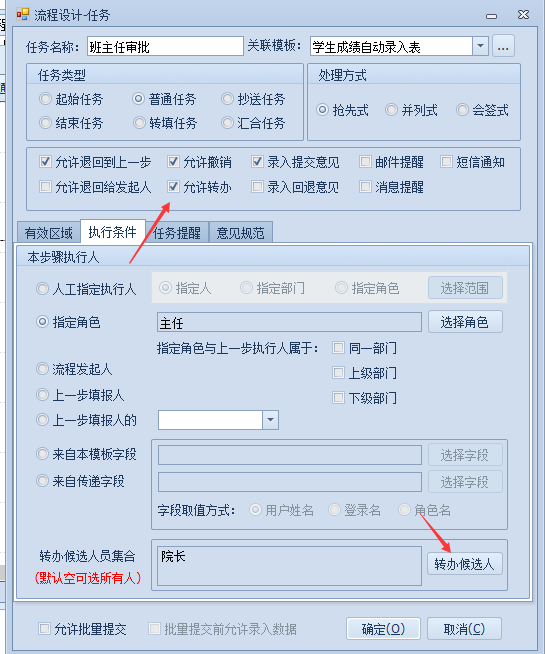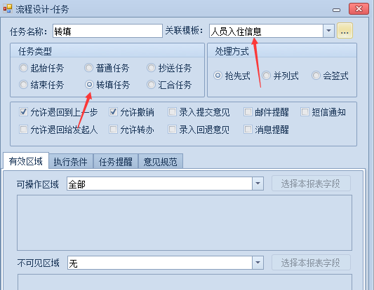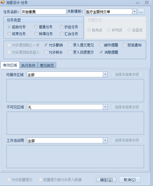 普通任务:上图主任审批,院长审批都是普通任务。选择任务,设置操作区域以及条件点击确认即可