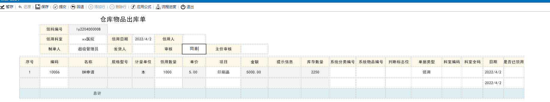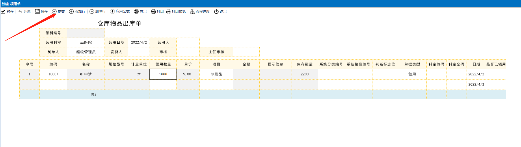 进入《领用单》界面,输入权限范围内相应的数据,然后点击【提交】按钮,如下图: