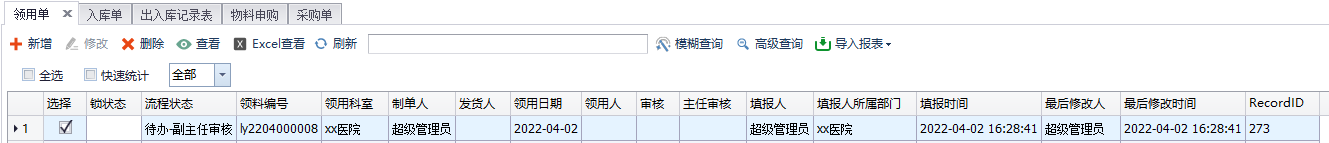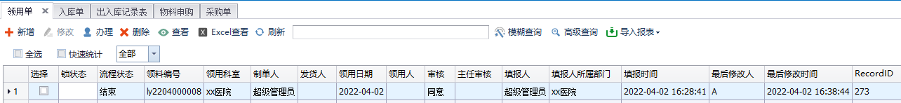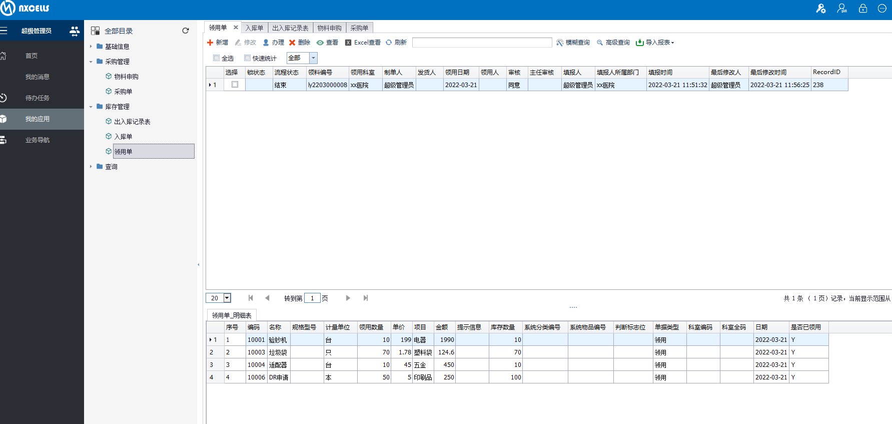 以无聊领取的流程为例,我们以系统管理员(admin)账号登录,新增《领用单》,如下图: