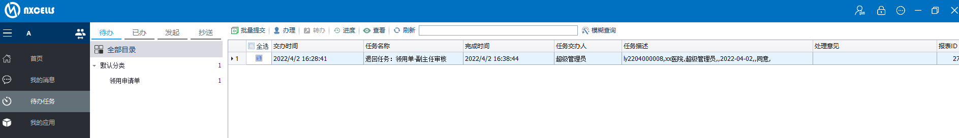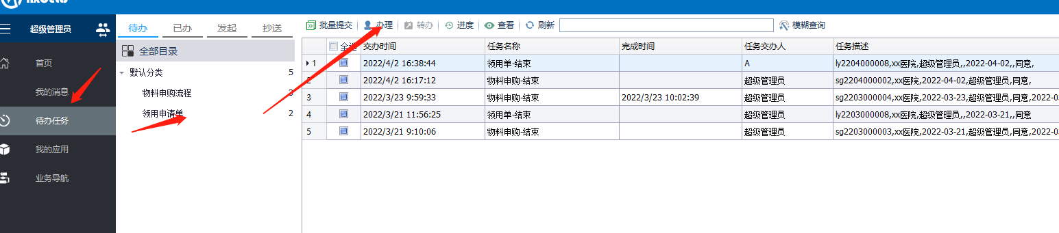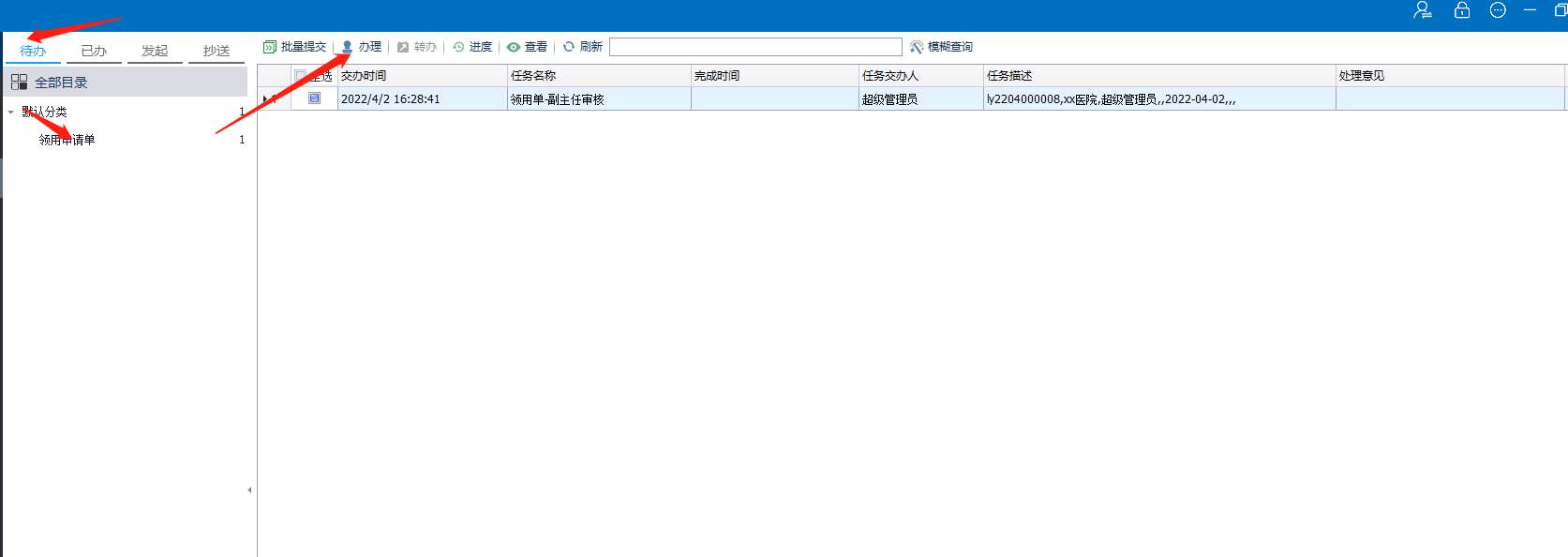 我们以(副主任)账号登录,即可在【待办任务】—【待办】—【领用申请】中看到需要办理的任务,选中一个任务点【办理】按钮