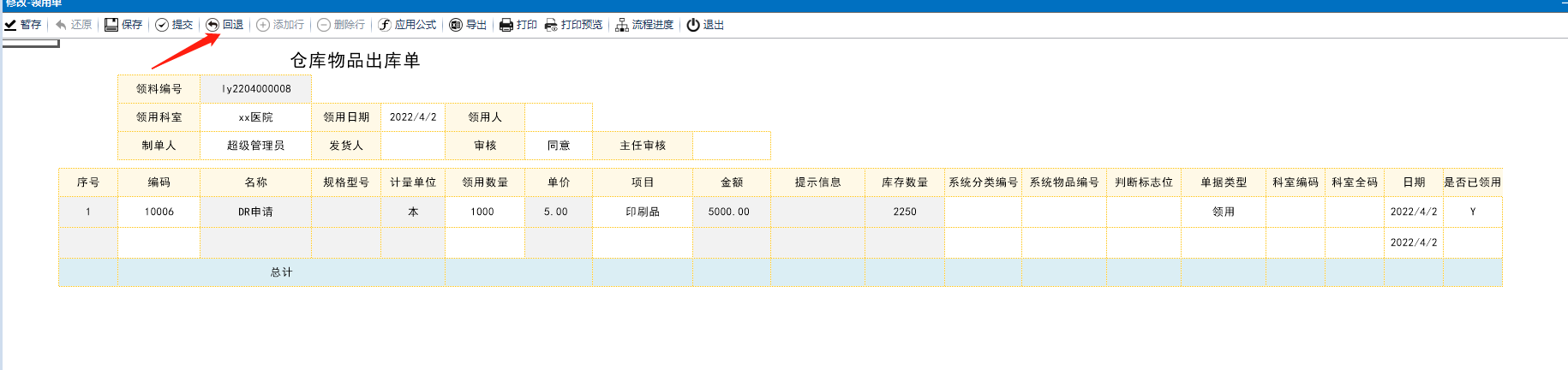 进入《领用单》界面,直接点击【回退】按钮,如下图:
