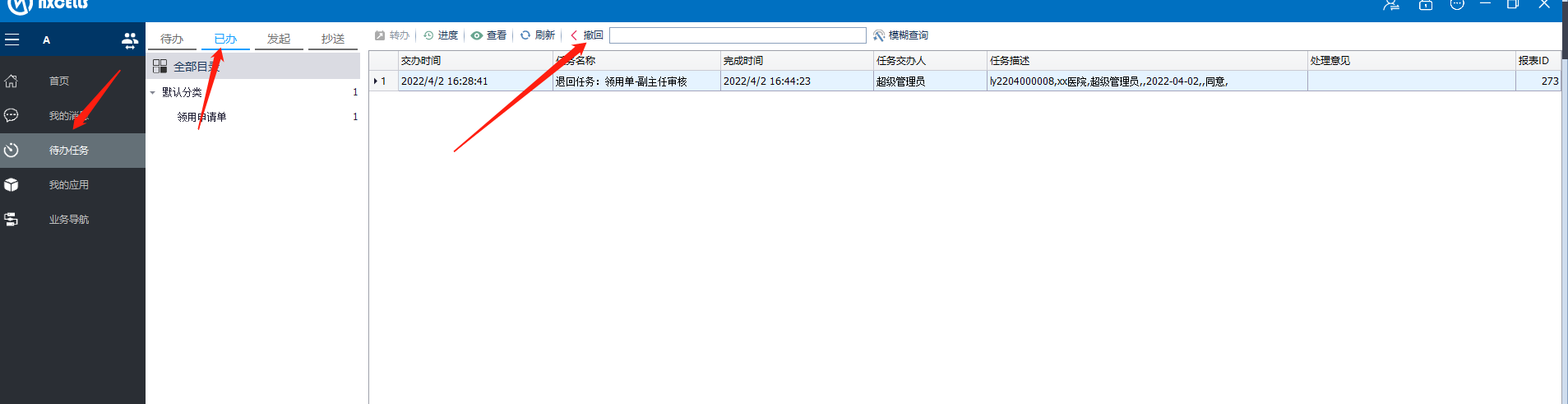 账号登录,即可在【待办任务】—【已办】中看到已经办理的任务,选中刚才已办的任务,点【撤回】按钮,如下图: