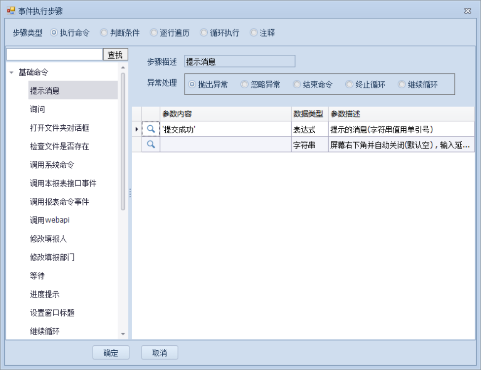 上一页 此基础命令会在按钮点击时弹出一个带消息的窗口,具体的弹出时机取决于管理员设计的事件类型。(注,此处字符串的引号,要使用英文状态下的单引号)效果如下: 提示:从nxcells3.5.5-1版本开始,支持指定时间自动关闭。 下一页作者:wang 创建时间:2021-11-04 14:24最后编辑:test 更新时间:2025-10-30 11:24