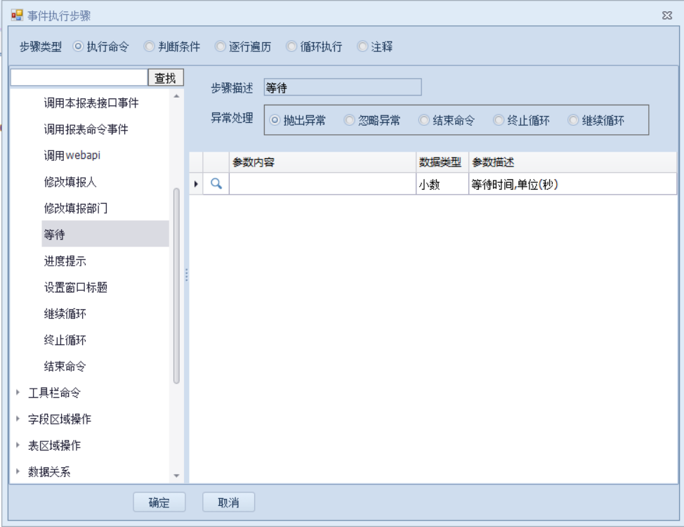 上一页 该命令通常是和其他报表命令组合使用,在等待一定时间后再进行后续动作。类似编程里的睡眠等待,常见在勾选了异步选项的命令中。 下一页作者:wang 创建时间:2021-11-04 14:32最后编辑:test 更新时间:2025-10-14 15:38