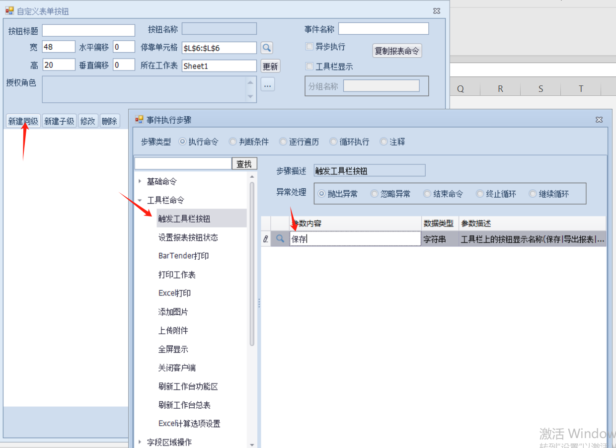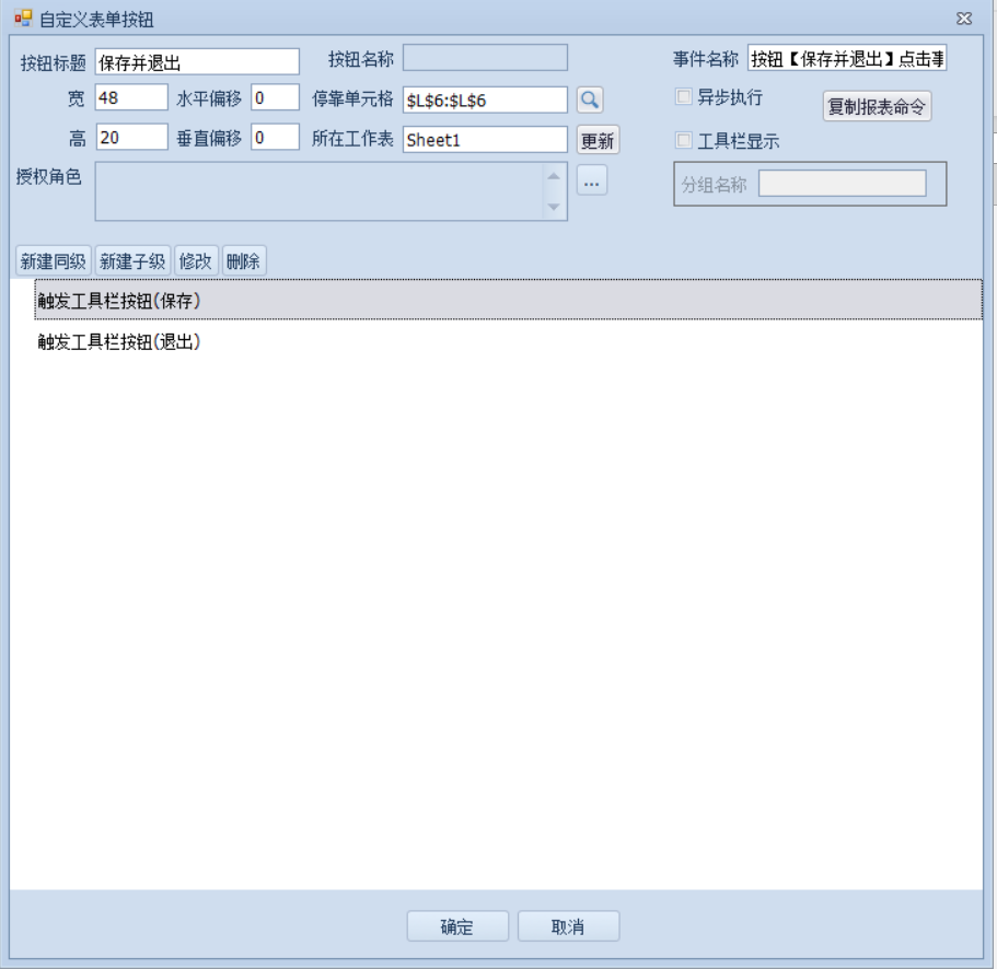 上一页 选中单元格,右键点【其他】→插入报表按钮,弹出界面,如下图:同上一步骤,再设置一个退出按钮,设置完毕后,效果如下:点【保存并退出】按钮,触发工具栏按钮设置完毕。 下一页作者:wang 创建时间:2021-11-04 14:46最后编辑:test 更新时间:2025-10-14 15:38