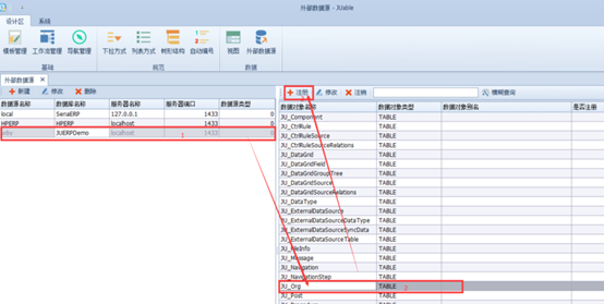 右侧显示所有可被注册的表,选择某个表,点【注册】按钮,如下图:
