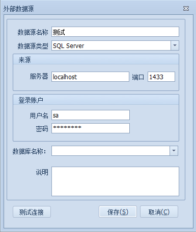数据库名称可下拉选择,点击”测试连接”,提示连接成功后,保存即可。如下图: