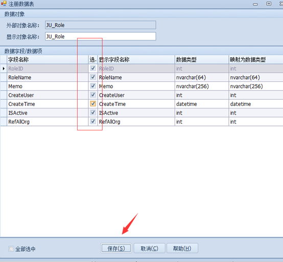 弹出注册数据表界面,勾选需要注册的字段,点【保存】按钮即可完成注册,如下图: