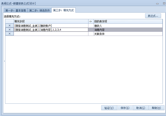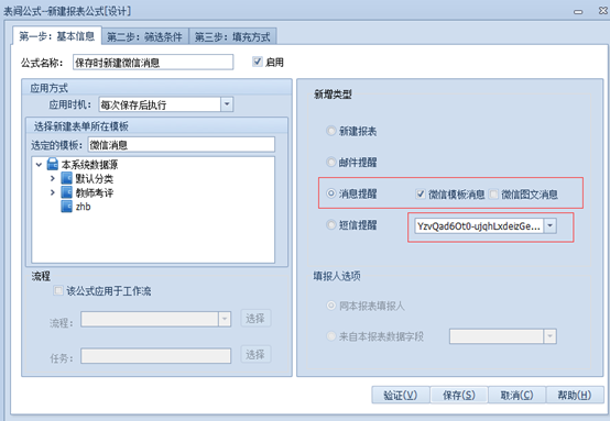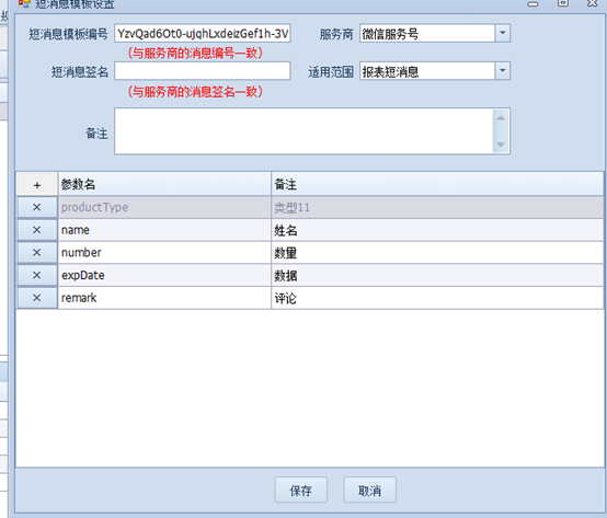 完善弹出框内的信息。【短消息模板编号】即为上方模板详情内的<模板ID>,【服务商】选择微信服务号,【适用范围】选择报表短消息。下方的参数的添加内容与数量必需与模板详情内的详细内容一致,如下图;