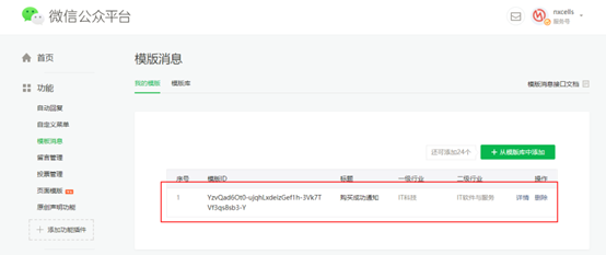 要使用微信模板消息,必须在服务号里的模板消息里面的模板库中添加所需要的模板方可调用。(如模板库里面没有自己所需要的模板,可自行申请一个模板以供使用)。