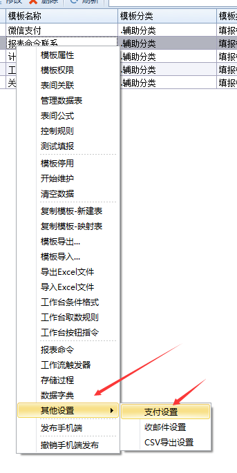 2.找到需要绑定支付的模板,右击,选择支付设置。