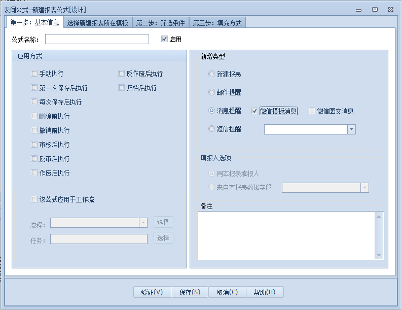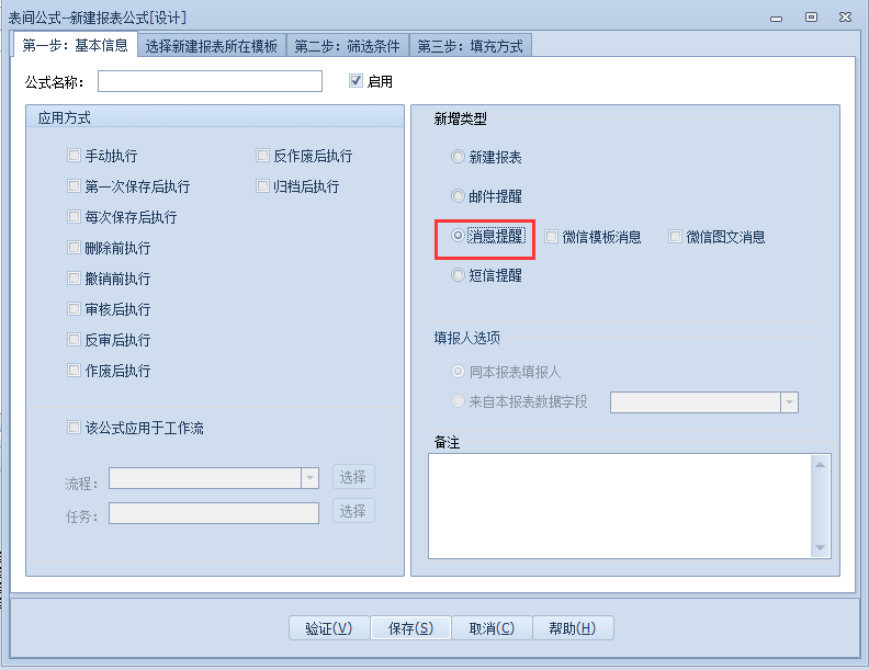 上一页 建立新建公式选择【消息提醒】既可以发送普通的text消息,也可以发送图文消息选择【微信模板消息】需要购买固定的微信模板使用;【微信图文消息】被【消息提醒】替代,无需选择 下一页作者:wang 创建时间:2021-11-05 09:17最后编辑:test 更新时间:2025-10-14 15:38
