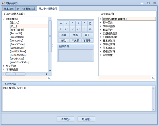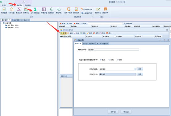 上一页 【设计器】-【模板设计】-【工作流触发器】-【新建】 填写触发器说明;选择要触发的操作;选择涉及到流程以及具体任务; 选择触发的工作流当中涉及到的模板 填写筛选条件 下一页作者:wang 创建时间:2021-11-05 09:27最后编辑:test 更新时间:2025-10-14 15:38