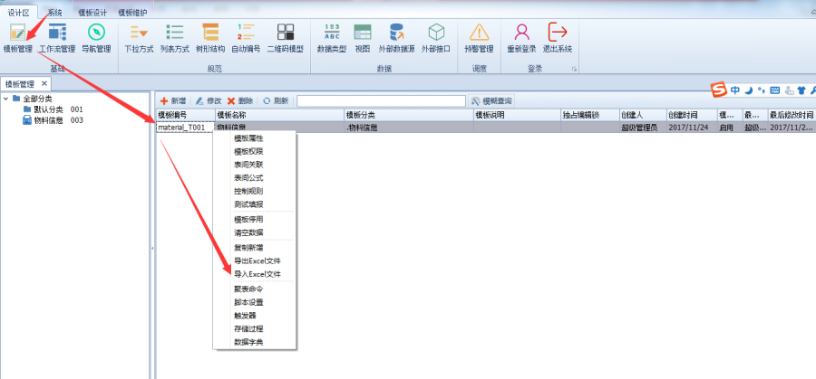 上一页 打开NxCells设计端 ,找到需要导入的模板,例如以导入物料信息为例。 【设计区】>【模板管理】>右击【物料信息】→【导入Excel文件】。在弹出界面选择需导入的.xlsm类型文件,然后打开即可。 下一页作者:wang 创建时间:2021-11-05 09:28最后编辑:test 更新时间:2025-10-14 15:38