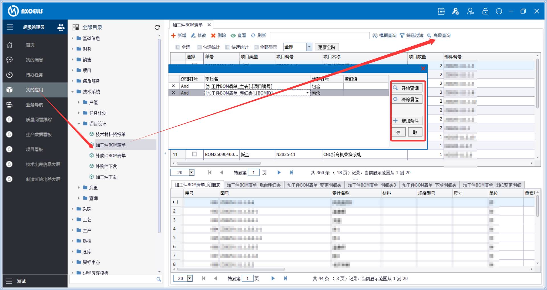 上一页 查找精确,通过输入的筛选条件准备高效的筛选出需要的数据。在客户端界面下查询加工件BOM,包含是指,查找对应字段有输入值的,可通过增加条件进行多条件查询,点到一个条件,点击存按钮,系统会记住此条件,下次打开会默认存在,取则会取消此条件,下次打开不存在 下一页作者:wang 创建时间:2021-11-05 09:30最后编辑:test 更新时间:2025-10-14 15:38