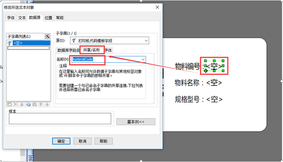 2、为每个传值对象设置一个共享名,此处设置是为了Nx调用Bartender命令时为其传值,【物料编号二维码】的共享名输入“materialCode”,【物料编号】的共享名输“materialCode”,