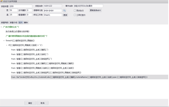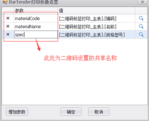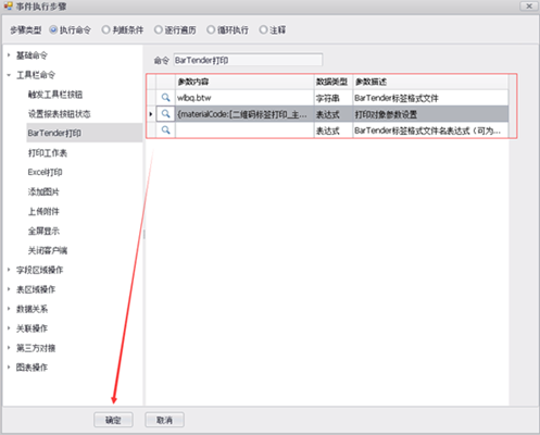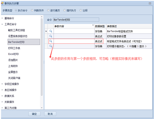上一页 1、在 “BarTender打印”报表命令的设计,右侧【BarTender标签格式文件】输入“wlbq.btw”,【打印对象参设置】点【查找】按钮,弹出界面,新增参数与本表字段对应,点【确定】按钮返回,如下图: 2、 打印对象参数设置如下: 报表命令详情如下: 下一页作者:wang 创建时间:2021-11-05 10:05最后编辑:test 更新时间:2025-10-14 15:38