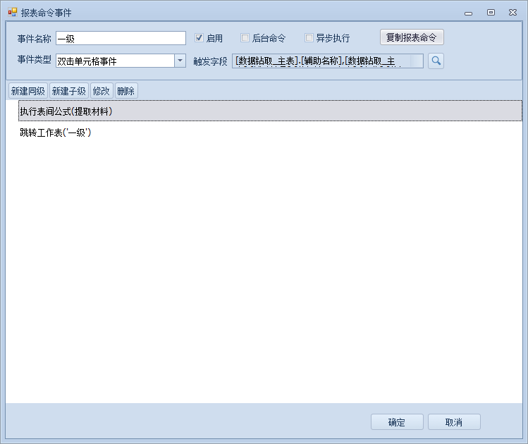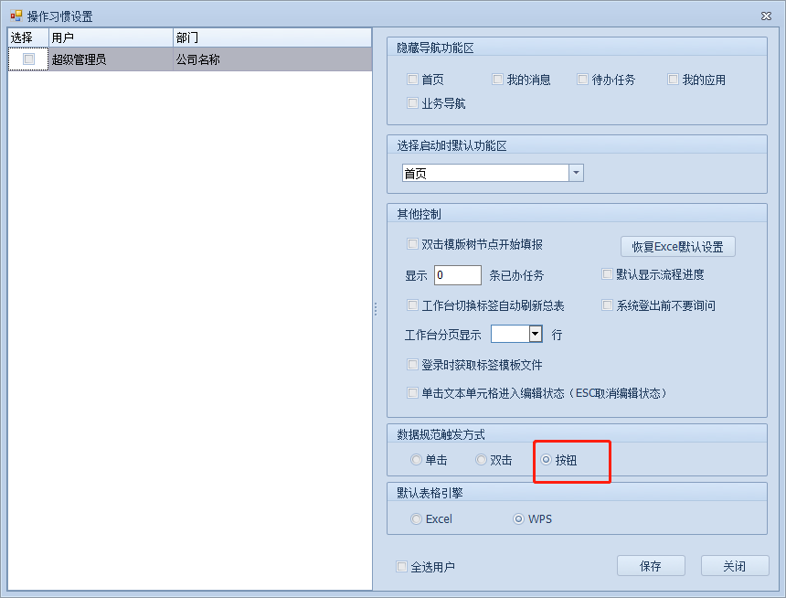 注意:根据自己设置的触发条件设置操作方式,例如这里应为设置了列表方式操作,报表命令是双击单元格触发,所以这里将数据规范操作方式改为按钮