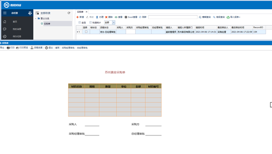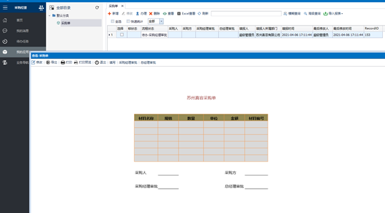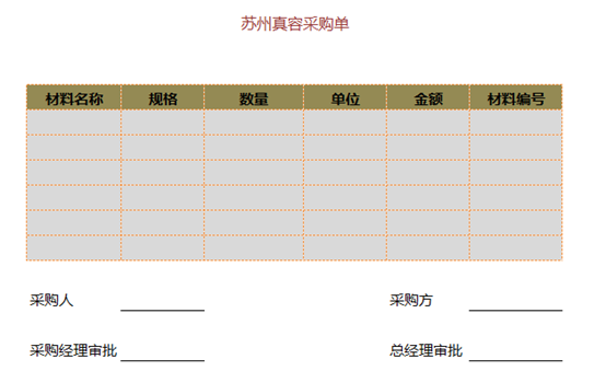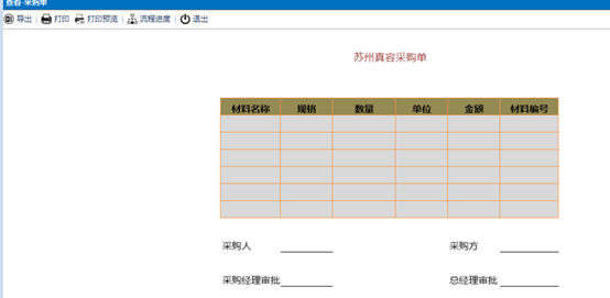 这里我们运用简单的采购单工作流采购经理审批和总经理审批来实现。采购单如下表如下图