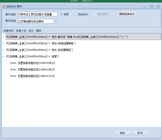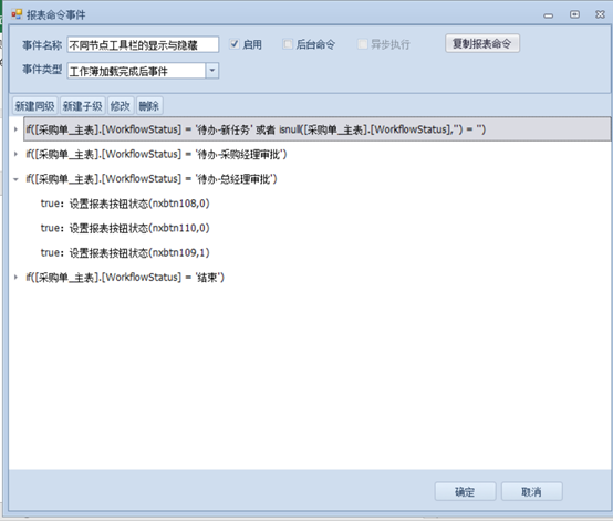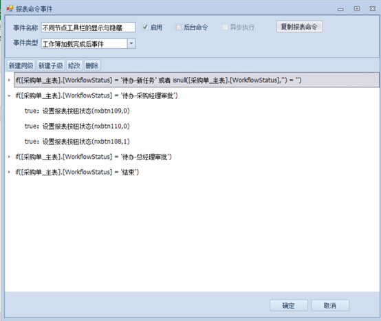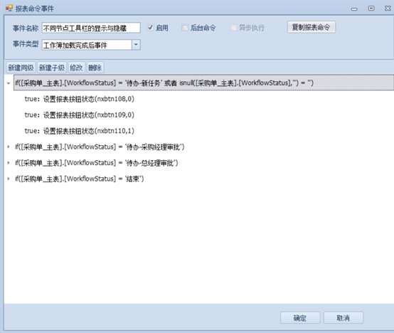 和工作流结束的时候有个结束。然后我们建立报表命令根据不同的节点来显示我们显示的按钮(在工具栏上显示)首先
