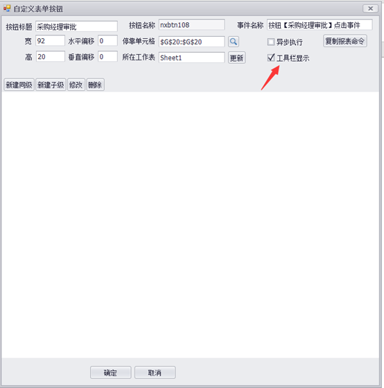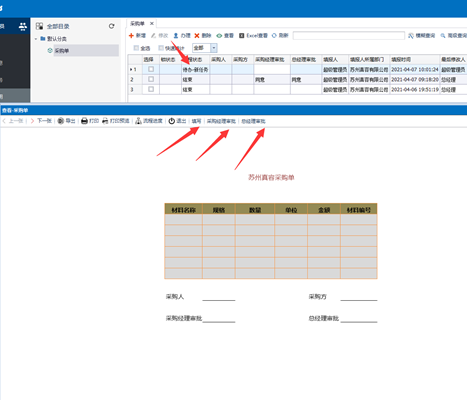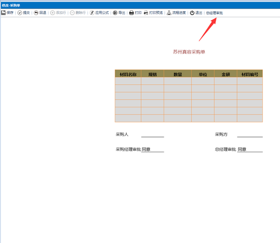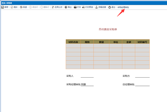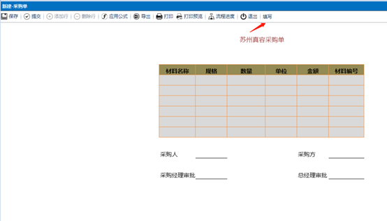 然后在这个采购单上设置三个按钮分别为经理审批,填写,总经理审批。然后把这三个按钮设置为在工具栏显示如下图