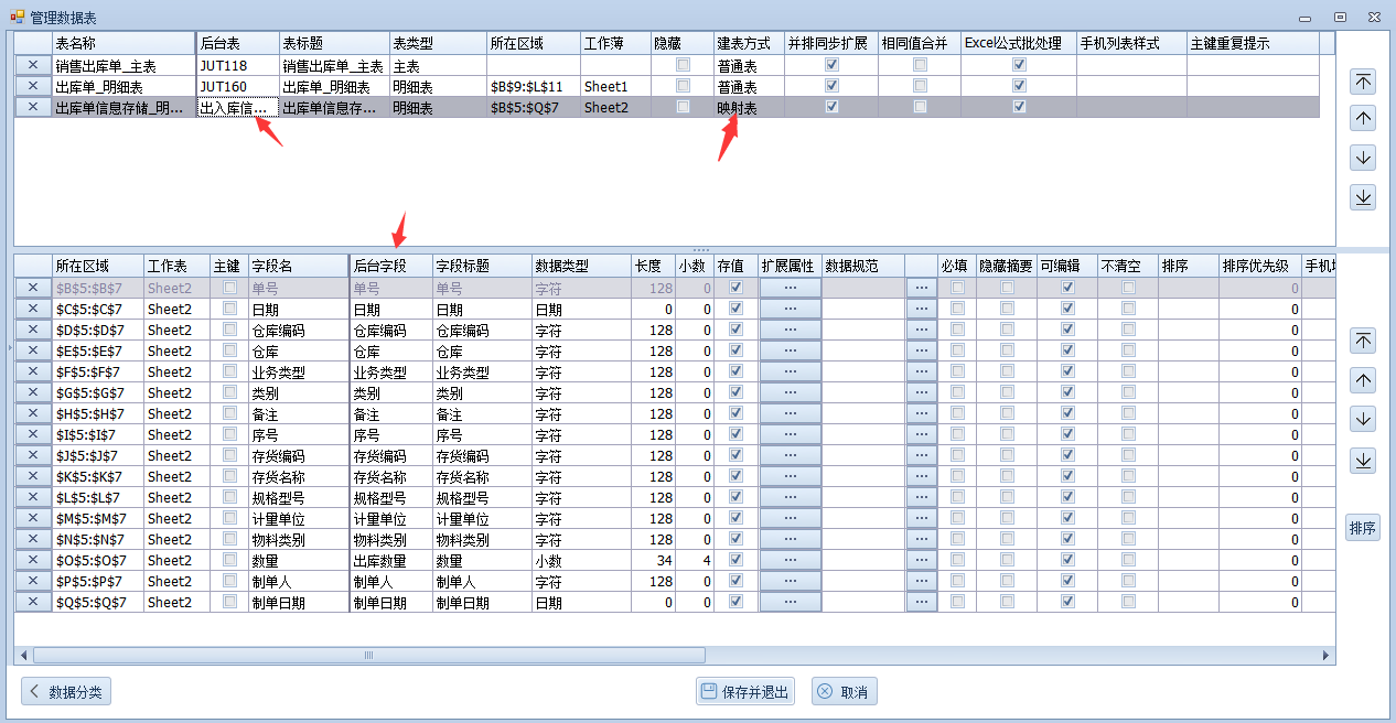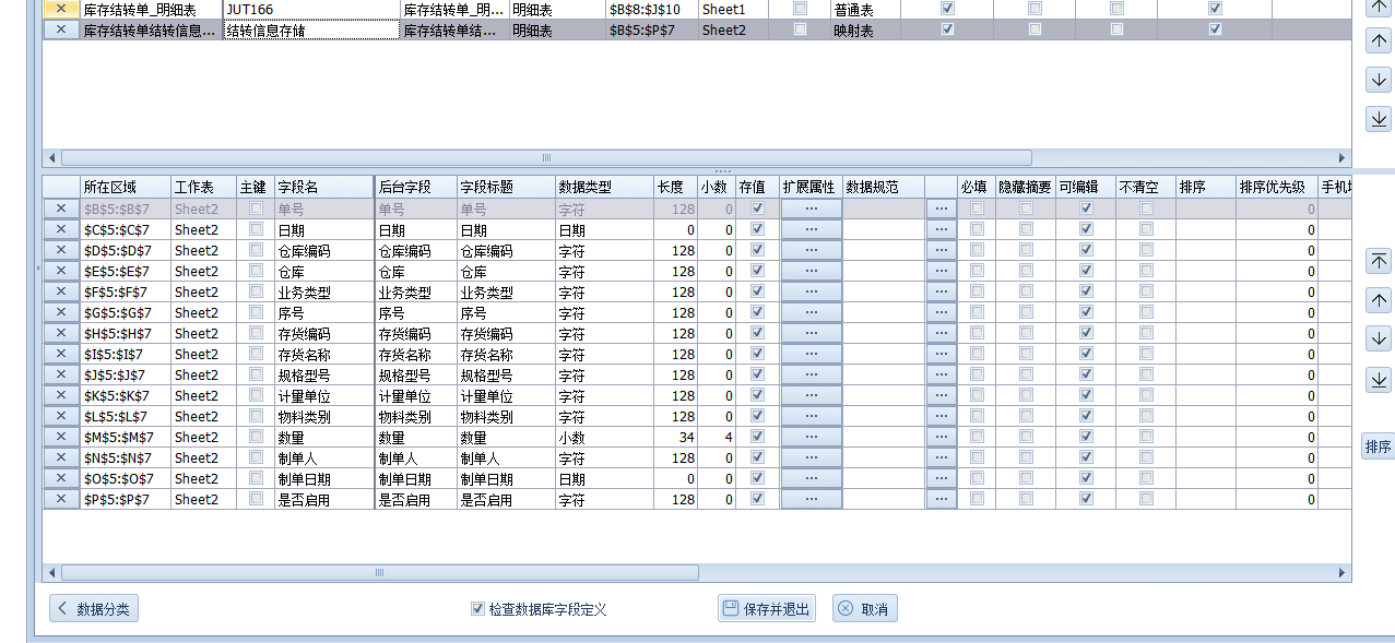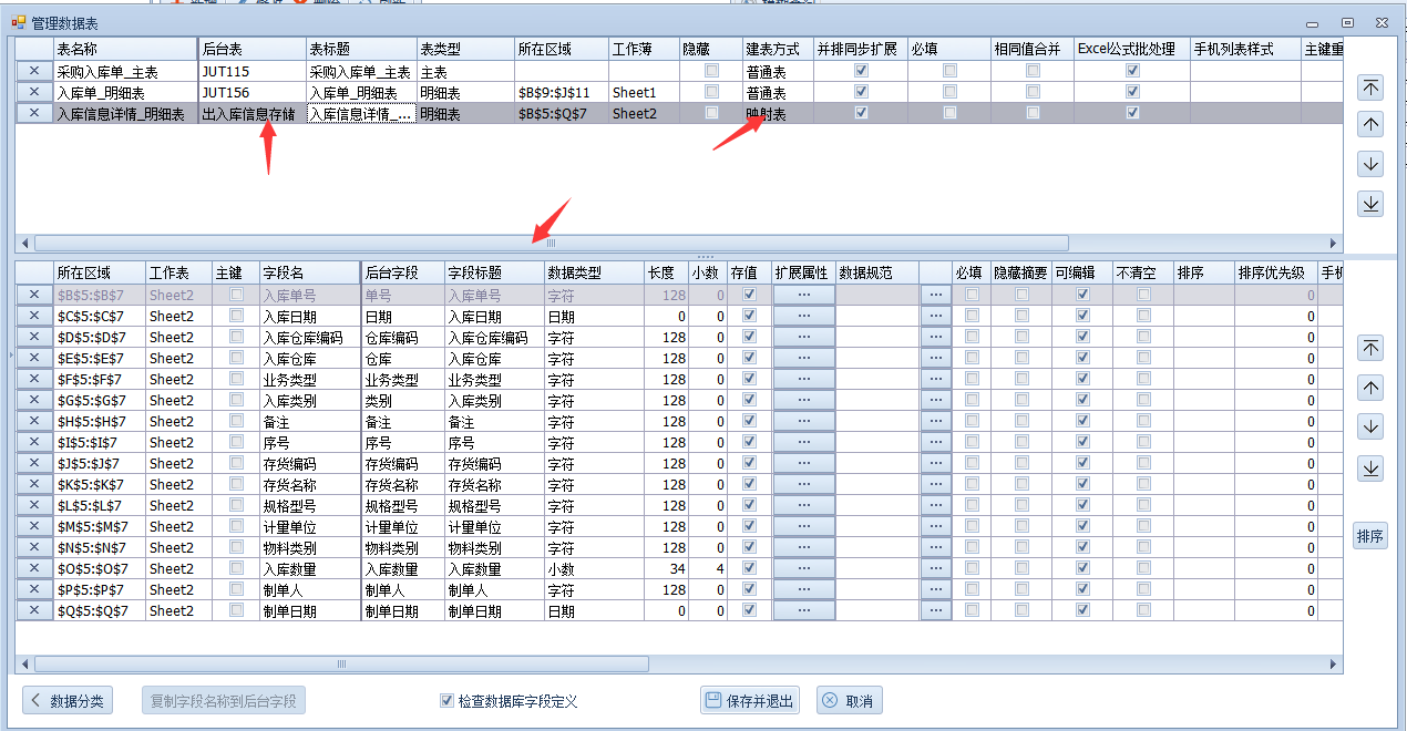 2、建立入库单、出库单映射表,将表名与字段名都指向刚刚建立的 出入库信息存储表 中. 下面的图为入库单表单,其中JUT115和JUT156两个表是真正的业务单据,出入库信息存储为映射表,建立一个保存时执行的提取公式,保存时将业务数据提取保存到出入库信息存储表中,为库存计算做数据准备