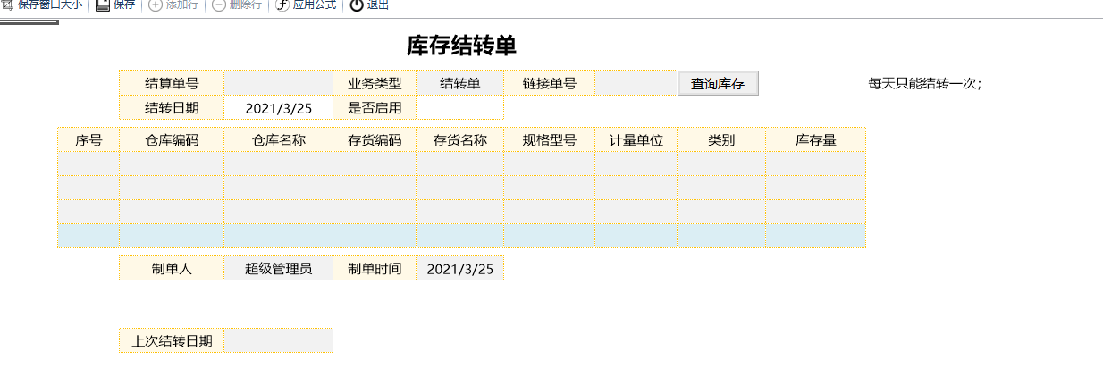 每天只能结转一次,并且只能有一个结转单是启用状态。这样每次算库存的时候都是从最近的结转单取数。