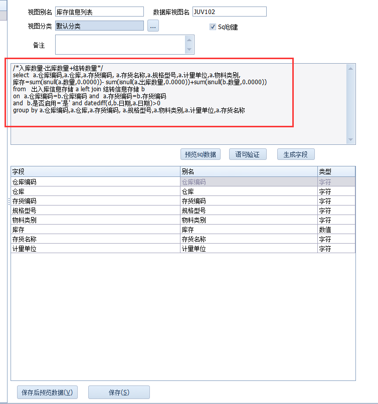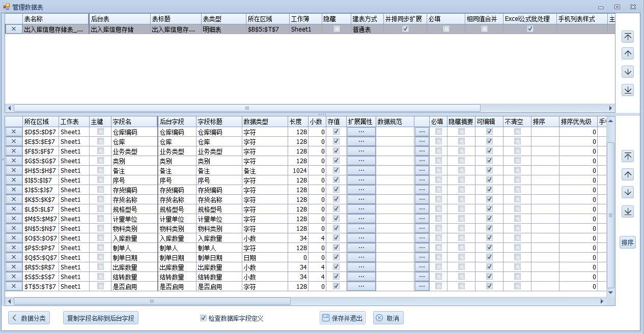1、在构建入库单与出库单之前,我们先将两个单据涉及到物料方面的字段提取出来,然后建立一个后台表,此表作为数据存储表,不管是入库单信息还是出库单信息,每次保存数据,都将数据存储到此表中。例如下图: