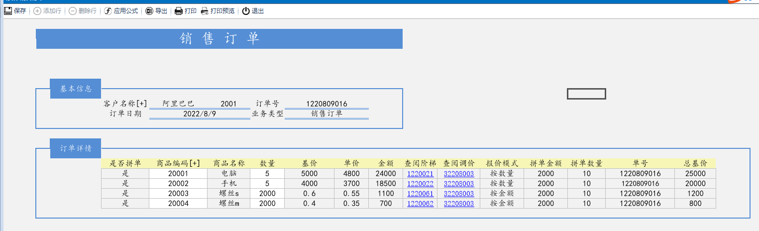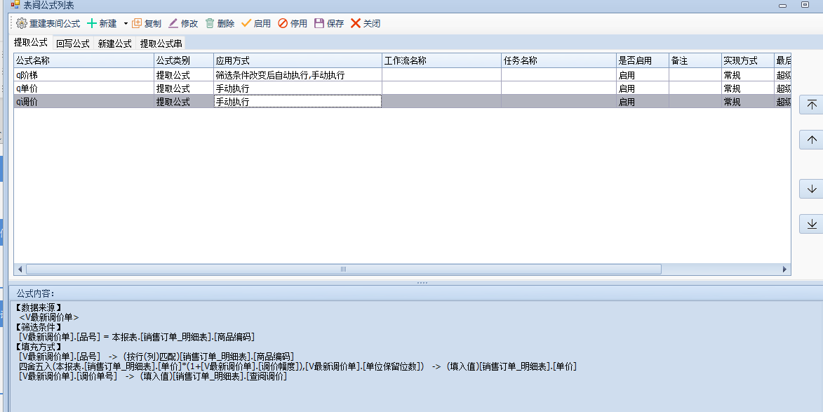 例如:建立销售订单模板的逻辑,需要建立如下几个提取公式(公式-q阶梯是提取阶梯价;公式-q单价是提取相应的单价;公式-q调价是提取该商品的调价信息)